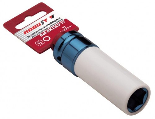 Desenvolvido para uso em rodas de liga leve pintadas e/ou cromadas, o soquete RK 12LV é fabricado em aço de alta resistência. Destaque para o acabamento anodizado, com diferenciação de cor para cada medida. Apresenta inserto interno e luva externa em Polietileno (PE) que protegem as rodas e os parafusos contra danos. Com alojamento para pino e anel de segurança. Encaixe a 12,7 mm (1/2”).