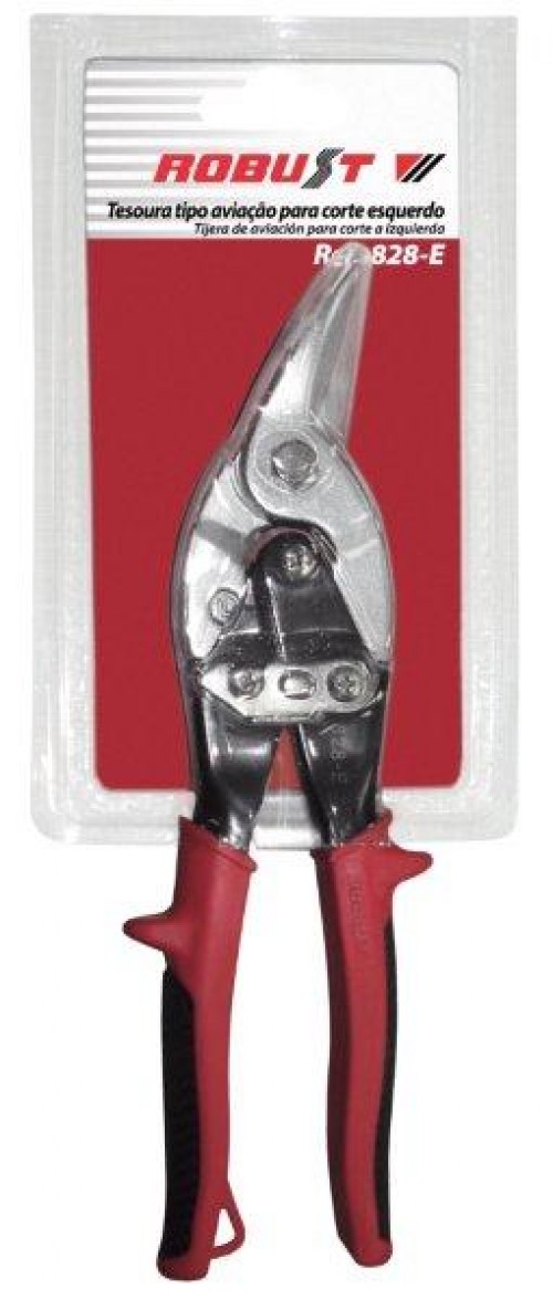 Aço especial, fosfatizado com cabos injetados em PVC. Projetada para transferir força extra de corte com ação combinada dos cabos para as lâminas. Corte endurecido por indução, para corte de chapa até 1,2 mm e aço inoxidável até 0,85 mm de espessura. Disponível em três modelos: corte para o lado esquerdo (ref. 828-E), corte reto (ref. 828-R) e corte para o lado direito (828-D). Embalado em blister para autoserviço.