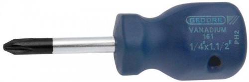 Aço Gedore-Vanadium. Haste niquelada e cromada, cabo em polipropileno azul, ponta fosfatizada. Chave com lâmina redonda, formato curto para parafusos tipo fenda cruzada “Phillips”.
