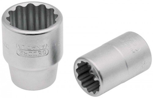 Aço Gedore-Vanadium. Niquelado e cromado. Para trabalhar com acessórios manuais. Paredes resistentes. Encaixe a 19,05 mm (3/4”).