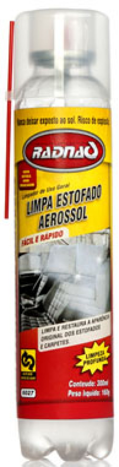 O Limpa Estofado Aerossol Radnaq é um produto de ação profunda e concentrada, que remove a sujeira mais difícil, restaurando a cor e a aparência original do estofado. Pode ser utilizado na limpeza de estofamentos de tecido, carpetes, almofadas, tetos residenciais e automotivos. Limpa com facilidade e deixa agradável odor, seca com rapidez evitando mal odor de umidade.