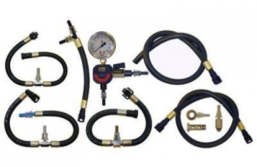 Conjunto para teste da linha de baixa pressão (pré-bomba), de caminhões diesel com injeção eletrônica. Adaptadores compatíveis com Mercedes-Benz, Cummins, MWM, Scania e Volvo.