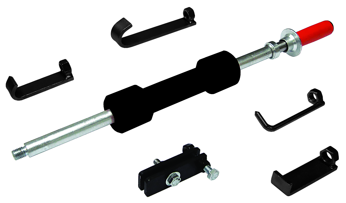 Marreta dinâmica com cabo anti-choque para desamassar latarias automotivas. A ferramenta é fornecida com quatro ganchos e um mordente, sendo este último indicado para o trabalho com chapas planas, sem dobras ou ressaltos.