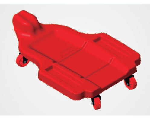 Esteira plástica com apoio para a cabeça, compartimentos para peças e ferramentas, estrutura metálica e 5 rodízios móveis para manutenções sob veículos. Peso máximo suportado: 150 kg.
