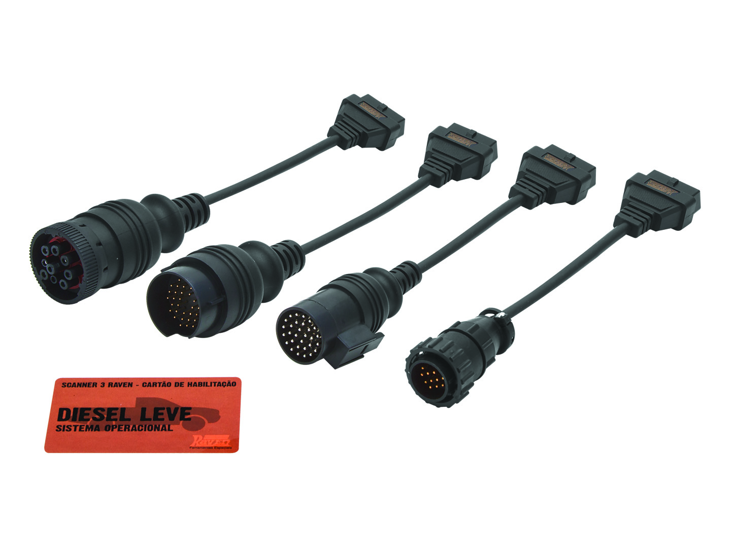 Kit Diesel Leve para utilização do Scanner 3 em utilitários a diesel, composto por quatro cabos de diagnóstico (padrões Ford, Iveco (2 modelos) e Mercedes-Benz) e um cartão de liberação de licença de software. Grátis 6 meses de acesso gratuito à enciclopédia Doutor-IE (esquemas elétricos e informações técnicas).