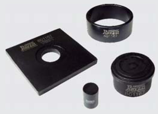 Conjunto de suportes e guias para extrair e instalar, em prensa, a pista interna do rolamento de apoio e a engrenagem (ambos do eixo de saída), e o rolamento interno da engrenagem intermediária da tomada de força dos motores MWM Acteon 7.2. Nº MWM D7002287C1