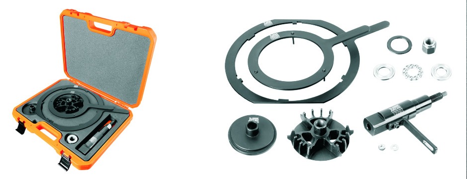 Conjunto de ferramentas com 9 peças para “resetar” a embreagem dupla da caixa de transmissão automática de 6 marchas Ford Powershift (DPS6 / 6DCT250) aplicada nos veículos EcoSport 1.6 / 2.0 16V 2ª ger. (12-17), Focus 1.6 / 2.0 16V 3ª ger. (13-19) e New Fiesta 1.6 16V (13-19). Atenção: Para extrair e instalar a embreagem dupla e os retentores das duas árvores piloto, utilize o conjunto 122500.
