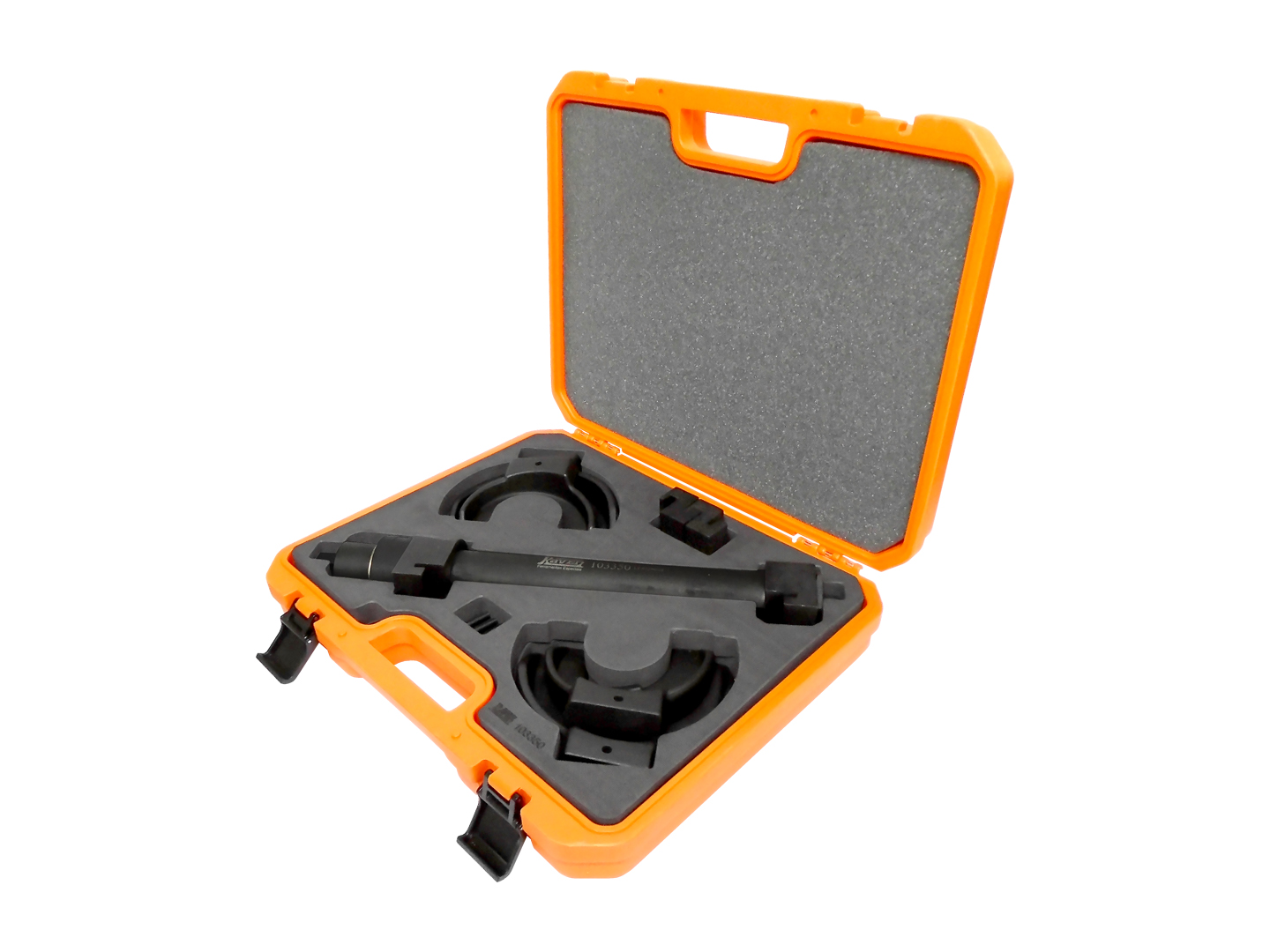 Encolhedor com garfos intercambiáveis para molas de suspensões dianteiras e traseiras do tipo McPherson. Composto por encolhedor de molas com rolamento axial (que reduz o esforço do operador) e encaixe sextavado de 21mm, 4 garfos intercambiáveis (sendo 2 para molas com Ø de 80 a 115mm e 2 para molas com Ø de 110 a 150mm), 2 prolongadores para os garfos e 4 parafusos. Exemplo de aplicação: molas dianteiras e traseiras dos VW T-Cross (19>), Tiguan 1ª ger. (07-17), Jetta 3ª ger. GLI (18>), Passat B8/8ª ger. (15>) e Passat CC (08-11) / CC (12-17), entre outros. Produto fornecido em uma maleta plástica especial grande.