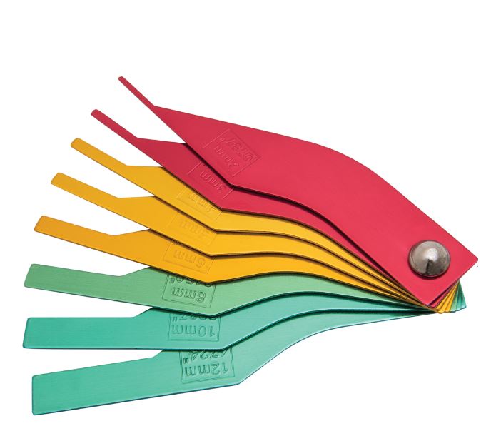 Produzida em chapas de aço especial, possui 8 níveis de inspeção graduados em milímetros e polegadas separados em três cores: verde (seguro), amarelo (atenção) e vermelho (perigoso).
