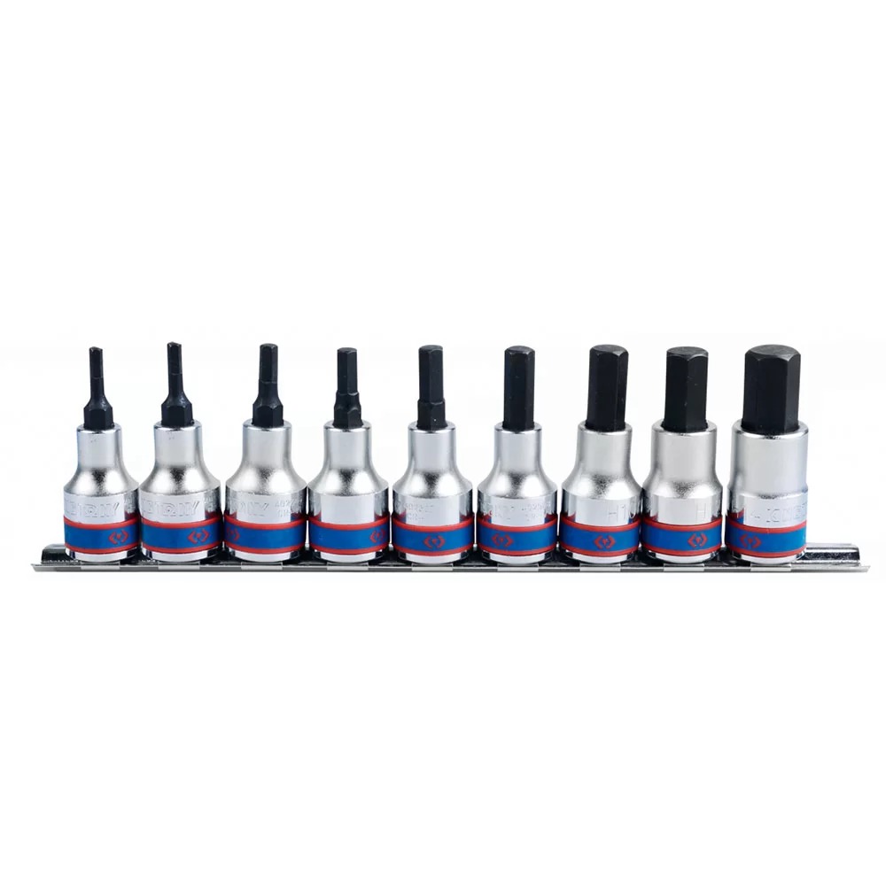 Jogo de chaves soquetes do tipo hexagonal possui nove peças feitas em aço cromo-vanádio, oferecendo resistência e durabilidade. As peças possuem encaixe de 1/2" e são indicadas para trabalhos manuais. Acompanha suporte em forma de trilho para os itens, proporcionando organização e praticidade para uso.